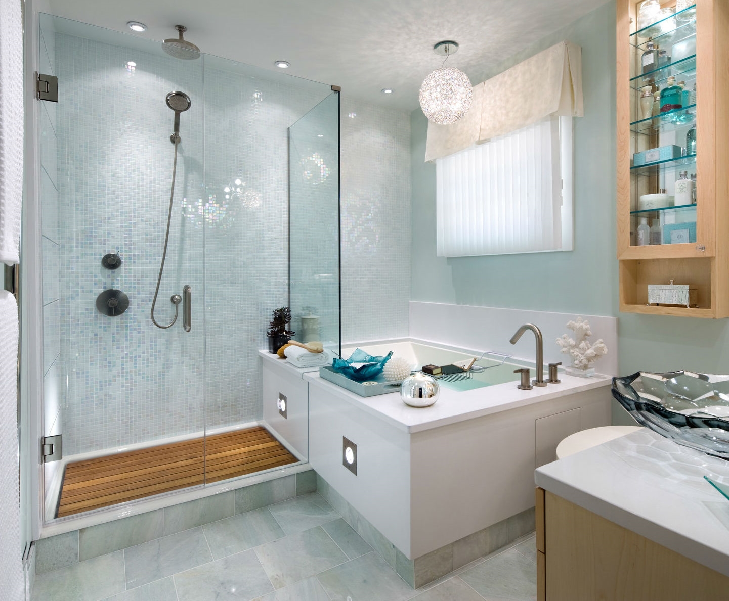 Дизайн натяжного потолка в ванной хорош тем, что скрывает возможные дефекты, уже имеющиеся в данном помещении над головами его жильцов.